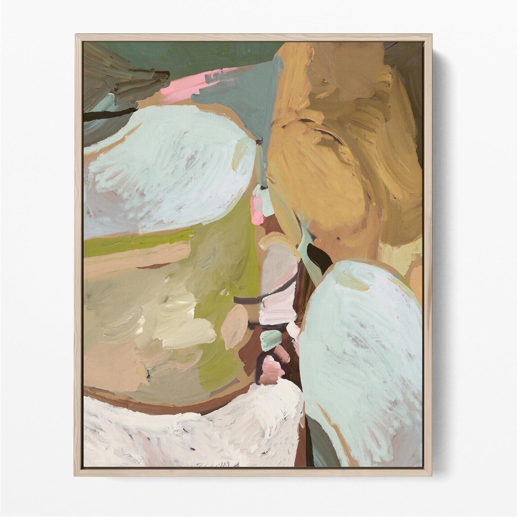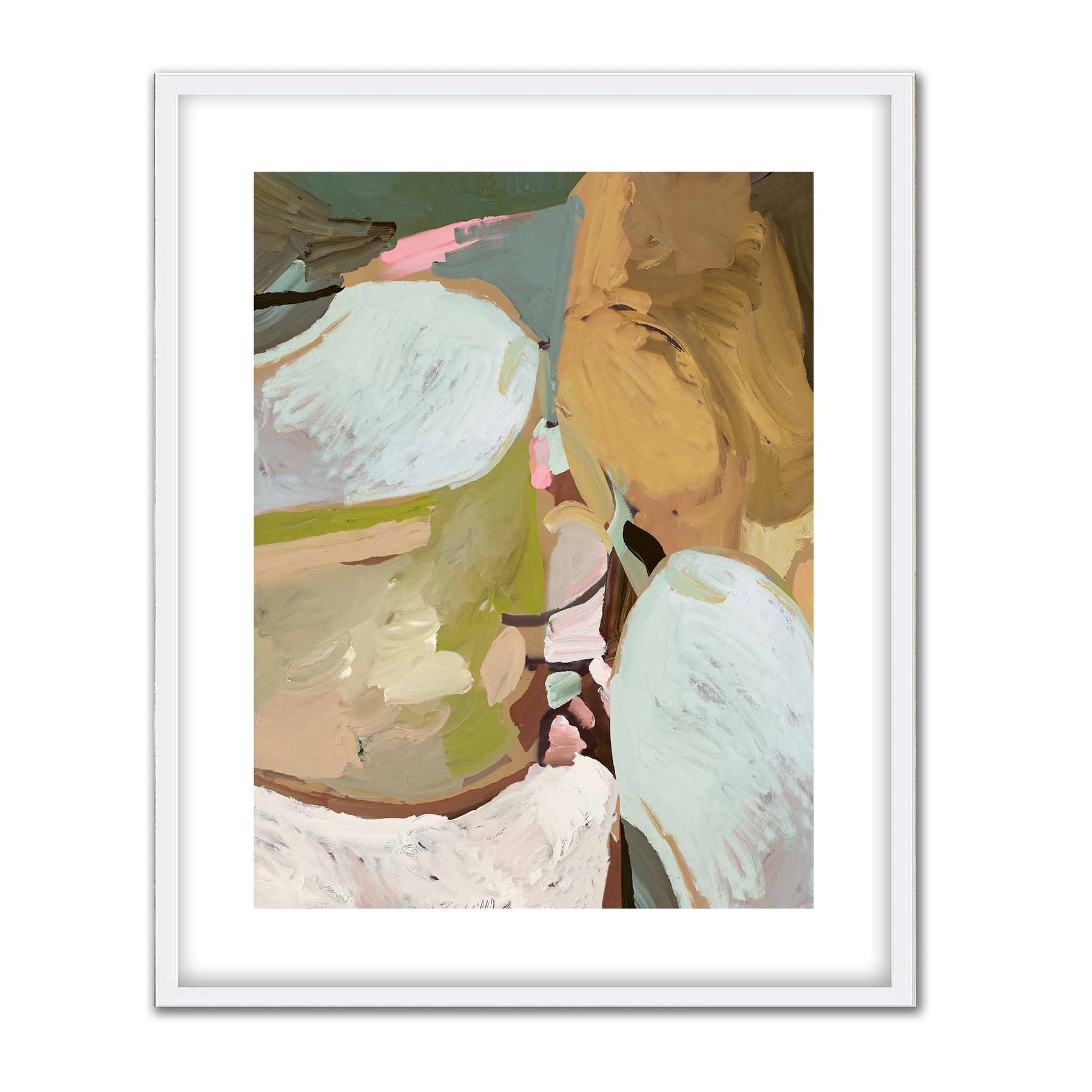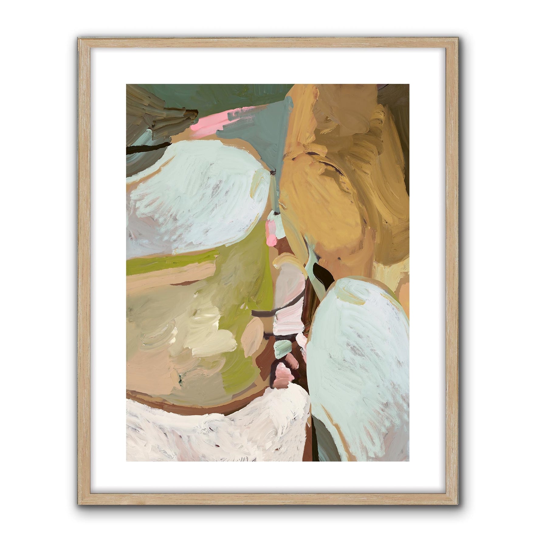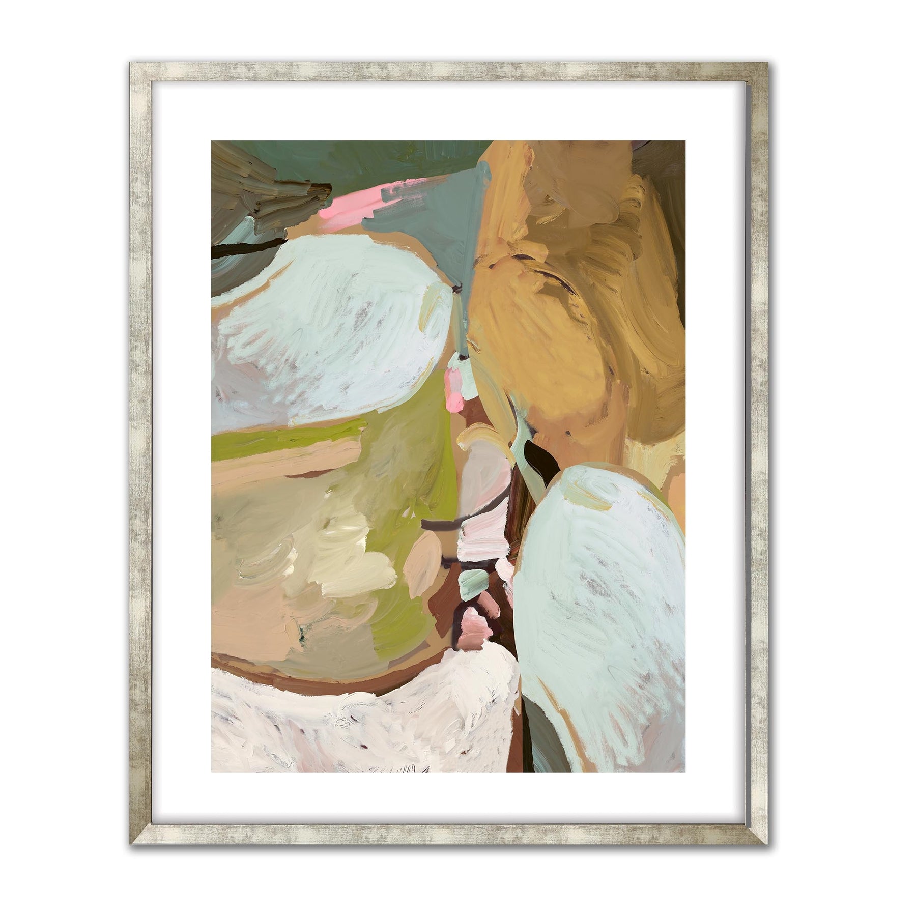 An abstract blend of earthy ochres, soft greens, and airy whites with hints of pink and teal..