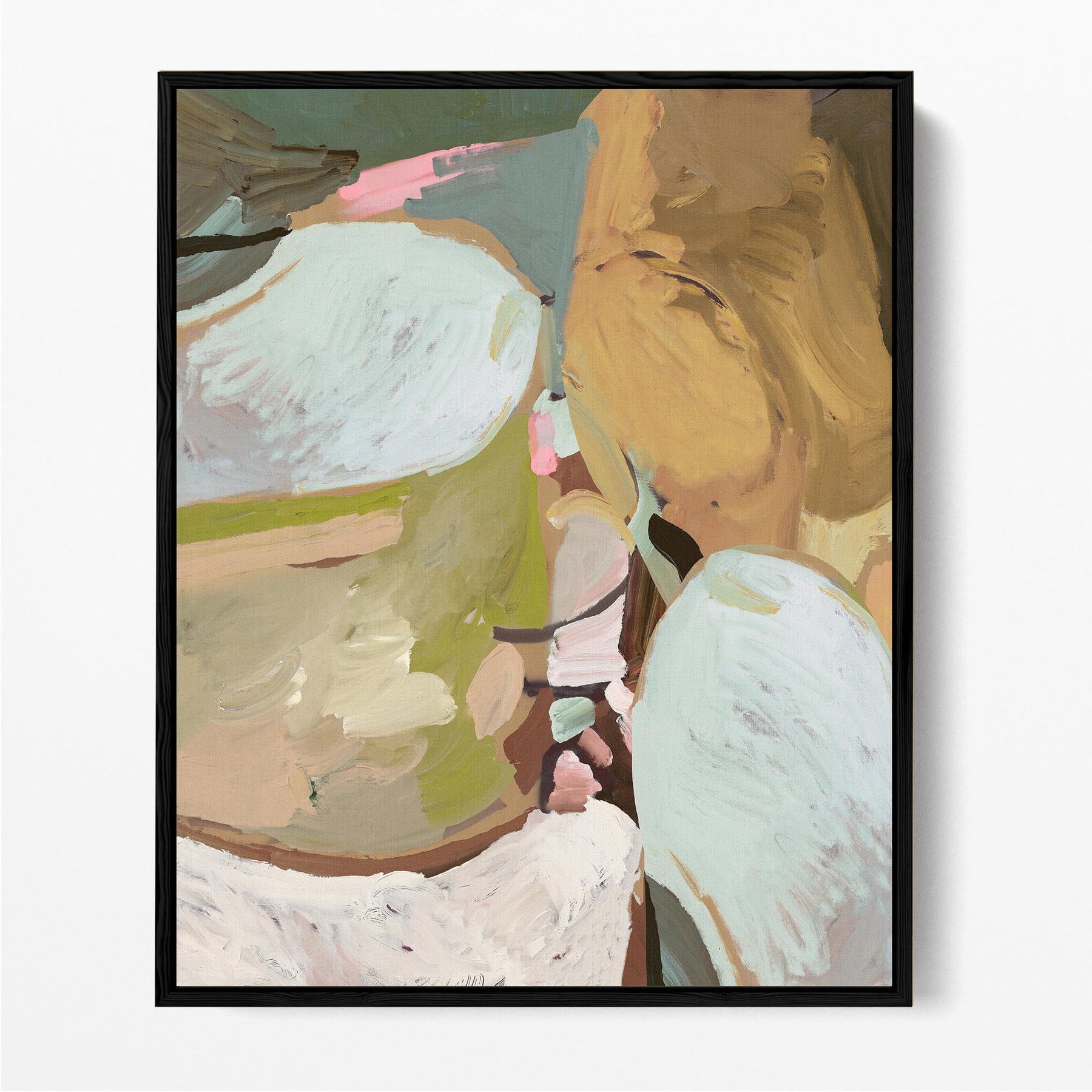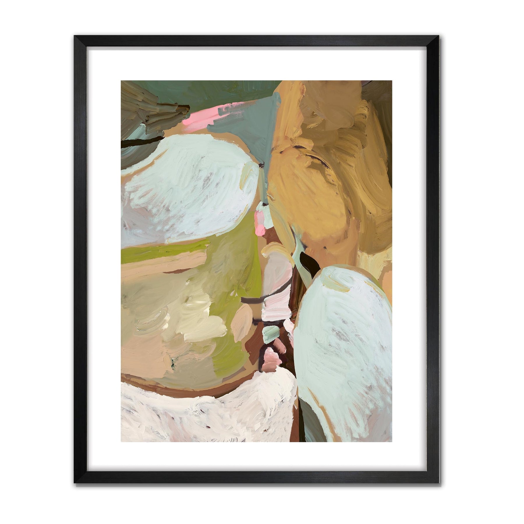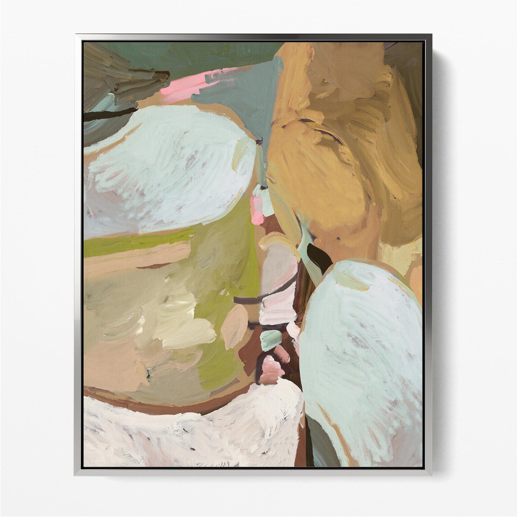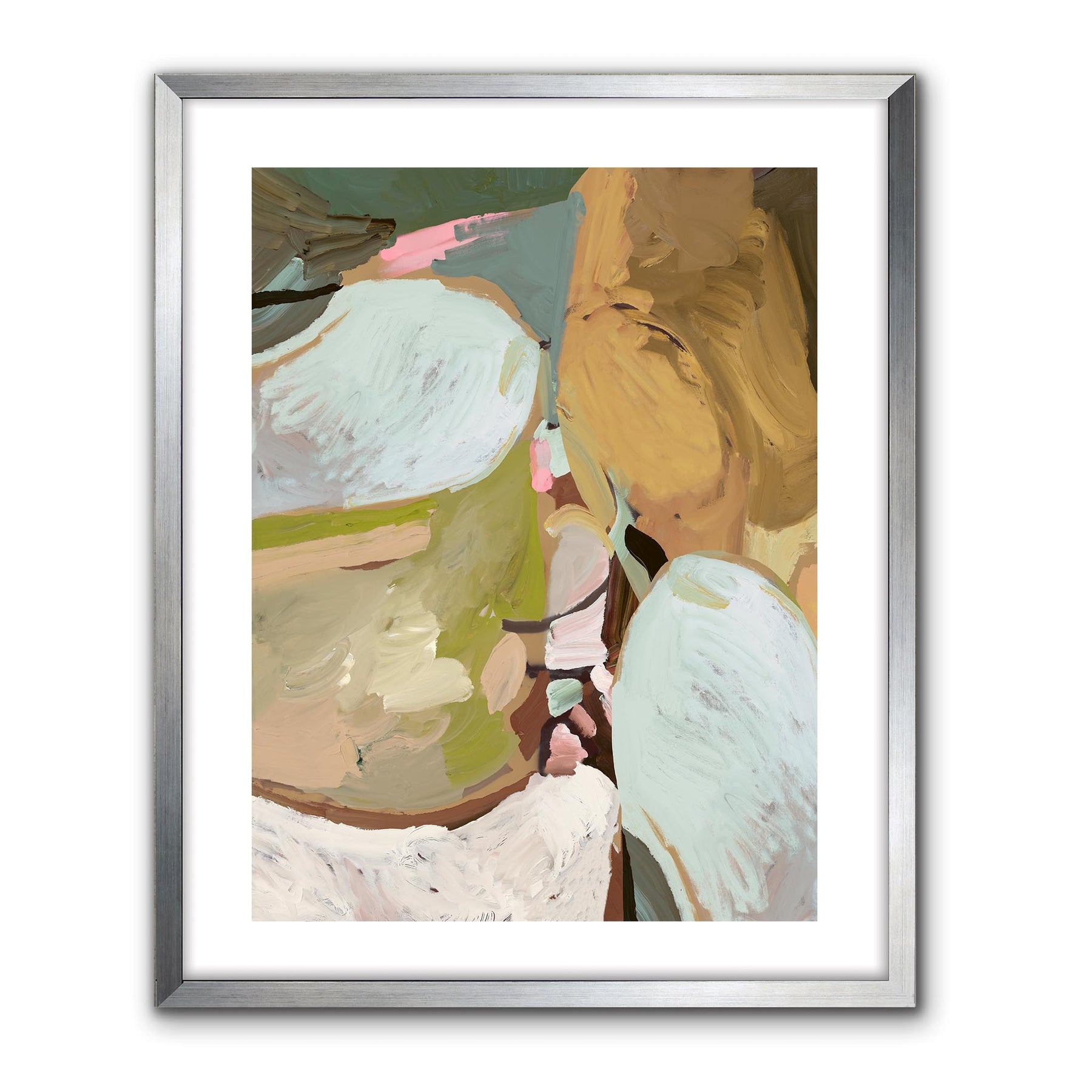 An abstract blend of earthy ochres, soft greens, and airy whites with hints of pink and teal..